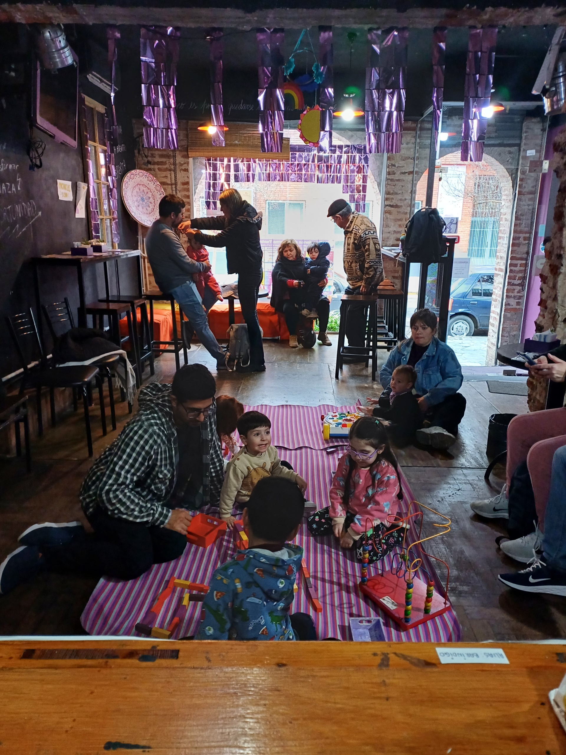 - Espacio para infancias: Contamos con una alfombra con almohadones y butacas pequeñas para que los más chiquitos puedan disfrutar de la función cómodamente.